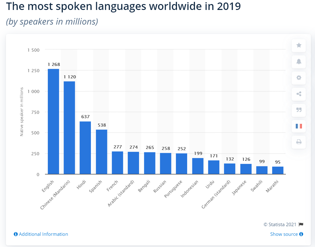 이 통계는 어디까지나 모국어 기준이기 때문에 그 나라의 인구를 반영한다. 중국 인구가 2016년 공식 통계로만 13억 7천만 명이다. 그다음은 스페인어인데 4억 6천만 명 정도로 본다. 알다시피 이는 스페인의 식민지였던 나라가 많아서인데, 멕시코뿐 아니라, 많은 중남미 국가들이 스페인어를 쓴다. 유튜브에서 가장 많이 본 노래인 'Despacito'가 스페인어(정확하게는 American Spanish)인데, 필자가 생각하기에 이 시각 현재 조회수가 72억까지 간 이유 중 하나가 스페인어를 모국어로 쓰는 인구가 그만큼 많기 때문이라고 생각한다. (놀랍게도 지금 이 시각 유튜브에서 가장 많이 본 동영상이 'Baby Shark Dance'이다, 조회수가 무려 78억이다.)