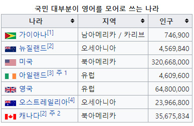 영어는 모국어 기준으로 보면 3번째로 많이 쓰는 언어인데, 영어를 모국어로 사용하는 나라는 대표적으로 영국, 미국, 캐나다, 아일랜드, 뉴질랜드, 오스트레일리아를 들 수 있다.(아래의 자료를 보면 특이하게 남미의 '가이아나'가 포함 됐다) 현재 위키백과에서 각 나라 인구 통계를 보면 영국 6,600만명, 미국 3억 3,000만 명, 캐나다 3,500만명, 아일랜드 490만 명 , 뉴질랜드 480만 명, 오스트레일리아 2400만 명, 다 합치면 약 4억 6,500만 명 정도 되는데, 실제로는 영어를 모국어를 쓰는 인구가 3억 7,000만 명 정도로 추산한다. 약 900만 명 정도 차이가 왜 나는지를 생각해 보니, 아마도 캐나다가 불어를 쓰는 인구가 거의 25퍼센트 정도라고 하는데 거기서 빠진 게 아닌가 싶다. 캐나다에서 가장 많은 인구가 산다는 퀘벡주의 경우, 유일하게 캐나다에서는 영어가 아닌 프랑스어를 공용어로 쓰는 주인데, 인구가 약 840만 명 정도로 추산한다. (위키백과 참고)
