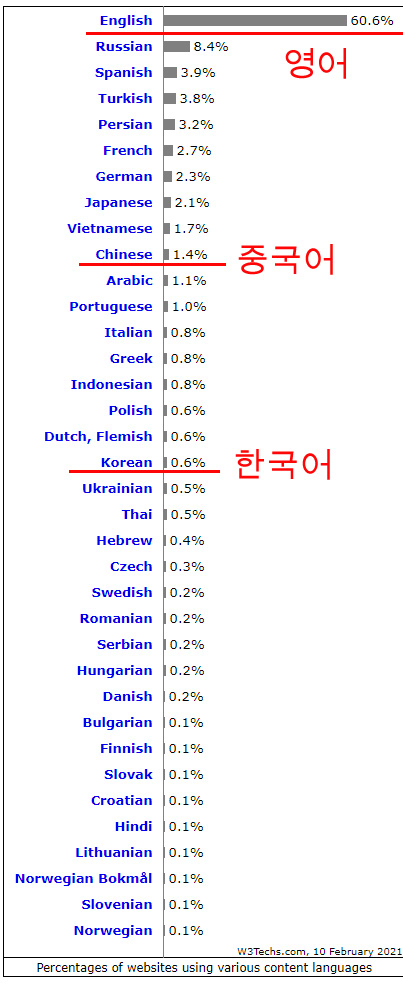 인터넷상에서 웹사이트 수로 따지면 압도적으로 영어가 1위다.