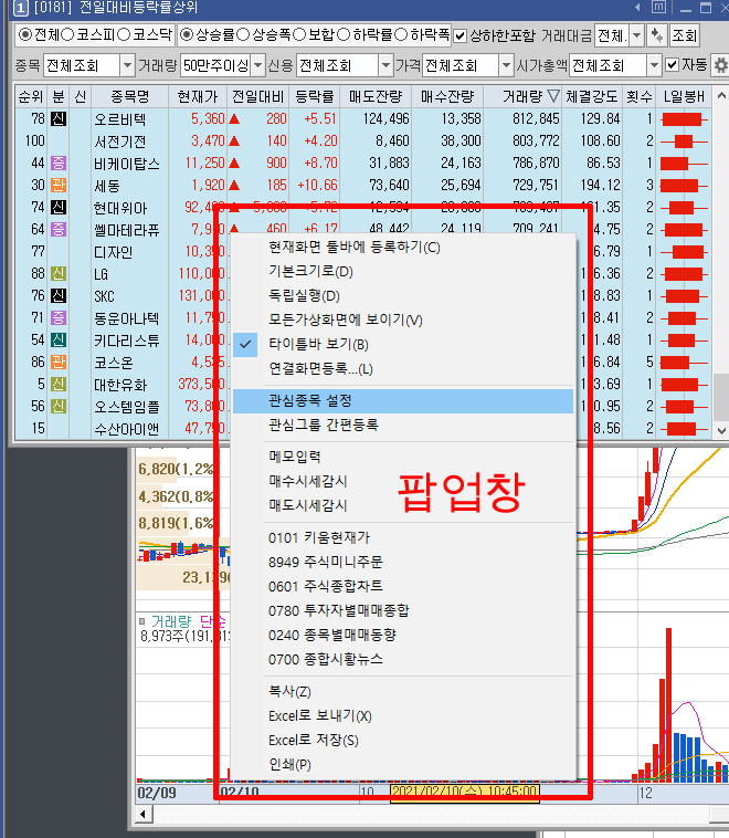 이 목록들을 나의 관심종목으로 저장하고 싶으면 맨 위에 있는 종목을 한번 클릭하고 'SHIFT'키를 누른 상태에서 맨 마지막에 있는 종목을 한번 더 클릭하면 목록 전체 선택이 된다.(이건 윈도우에서 파일 다중선택시 흔히 활용하는 방법이다) 목록들의 배경색이 하늘색으로 변한 것이 보이면 전체 선택이 된 거다. 그런 후 전체 선택이 된 아무 곳이나 오른쪽 마우스 버튼을 누르면 위와 같은 팝업창이 뜨는데, 거기서 '관심종목 설정'이라는 항목을 클릭하자.(이 또한 윈도우에서 기본적을 활용하는 방법이다)
