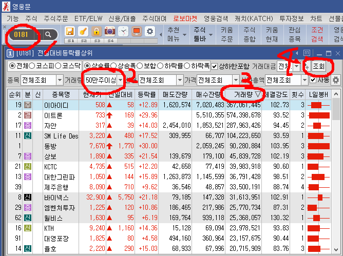 1번이라는 숫자가 보이는 곳에 숫자로 '0181'을 입력하고 엔터를 치면 위의 그림처럼 '전일대비 등락률 상위'라고 하는 창이 하나 뜬다. 전일 대비니까 전일에 비해서 거래량이 많이 증가했다면 실제 거래량이 얼마 안 되더라도 다 검색이 되기 때문에 필자는 2번에서 '50만 주 이상'이라는 조건을 하나 더 넣었다. 필자는 3번 부분을 클릭해서 거래량 순위로 순서를 정렬했다