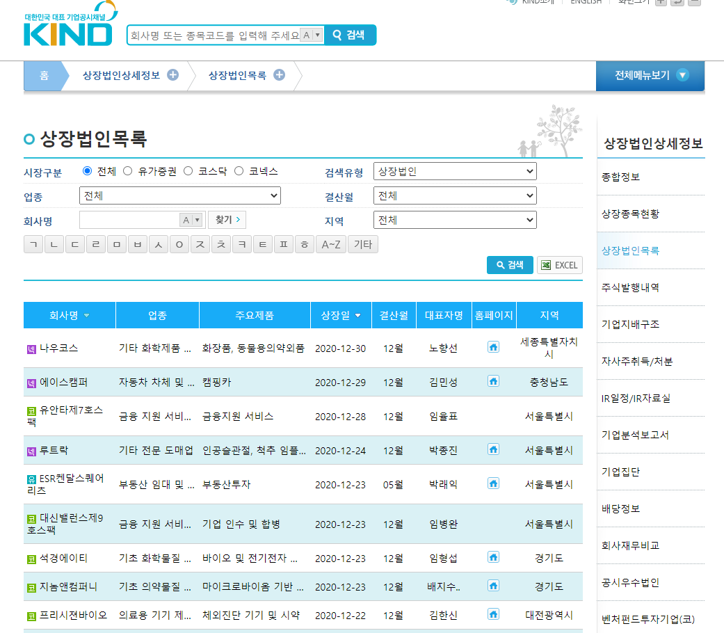 한국 거래소(전신, 한국증권거래소)는 코스피, 코스닥, 코넥스 같은 거래소 시장을 개설하고 운영하는 곳으로 대한민국의 자본시장을 종합적으로 관장하는 회사라고 한다. 이름만 보면 무슨 국가기관이나 공공기관 같은 느낌이 들지만, 주식회사이며 대기업으로 분류된다. 어쨌거나, 카인드 메인 페이지 우측에 보이는 [전체메뉴보기]에서 [상장법인상세정보]-[상장법인 목록]을 클릭하면 위와 같은 페이지가 뜬다. 가장 최근 상장된 기업순으로 보여준다. 검색버튼 우측에 EXCEL을 클릭하면 상장기업 전체의 목록을 엑셀 파일로 다운 받을 수도 있다.