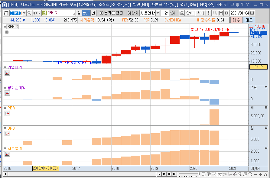 '흑자 전환'은 말 그대로 회사가 손해를 보다가 이익으로 돌아왔다는 의미인지는 누구라도 다 알 것이다. 흑자 전환의 기준을 보통 2가지 지표를 참고하는데, 바로 '영업이익'과 '당기 순이익'이다. 네이버나 다음 같은 포털사이트의 증권 정보 제공 사이트에서도 볼 수도 있지만, HTS에서 제공해 주는 '재무 차트'를 보는 것이 여러가지 면에서 더 효율적이고 편하다. 필자는 HTS로 영웅문을 쓰는데, '기업정보'-'재무 차트' 페이지를 보면 월, 분기(1년 4분기), 년 별로 조회를 해볼 수 있다.