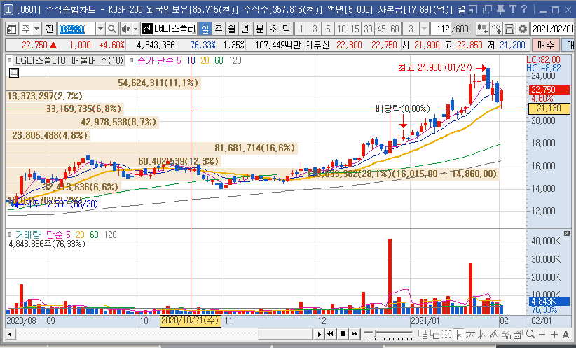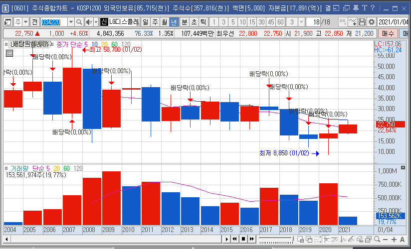 다른 지표들은 두고라도 LG 디스플레이의 일봉을 보면 최근 두어 달 사이에 힘차게 올라오다가 지난 주 지수에 밀려 하향 곡선을 그리는데 필자는 주목한다. 필자는 지수에 잠시 밀린 것이지 이 종목 자체가 힘이 없어서 그런 것이라고 생각지는 않는다. 필자는 이런 종목을 꾸준하게 지켜 보다가 저점이라고 여겨지는 적당한 시점에서 매수하는게 좋다고 판단한다. 필자가 현재 이 종목을 보유중인지에 대해서는 노코멘트 하겠다.